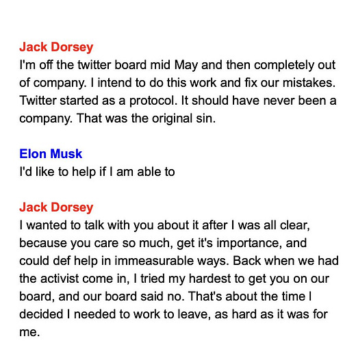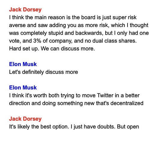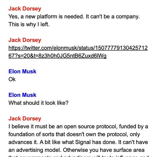 And this conversation between Elon Musk and Jack Dorsey (former CEO of Twitter) really intrigued me.